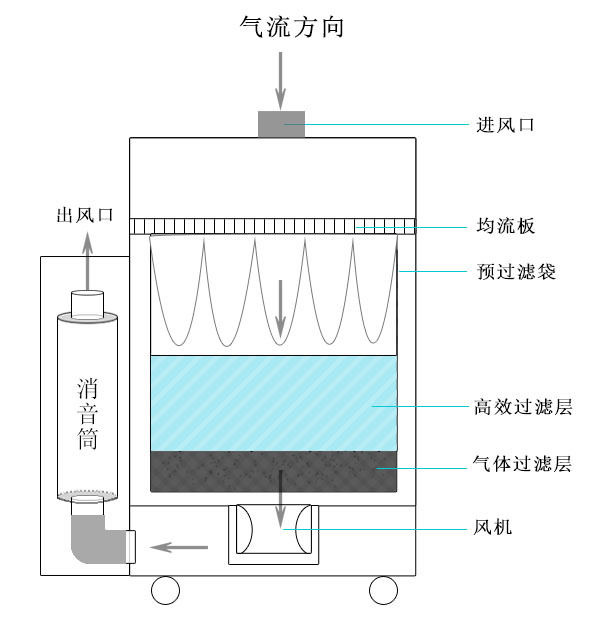 1.煙塵廢氣通過吸煙管/吸煙口進(jìn)入凈化機(jī)內(nèi),首先經(jīng)過均流板導(dǎo)流,