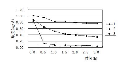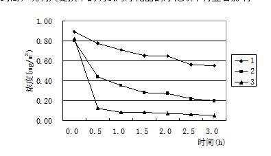 圖2 比較(圖2)中的三條凈化效率曲線可以看出,在相同的測(cè)試條件下,使用相同的技術(shù),但是凈化效率卻有很大差異,2號(hào)產(chǎn)品能使甲醛濃度迅速下降,1h內(nèi)即達(dá)到0.1mg/m3以下,可是1號(hào)產(chǎn)品在開啟3h后,甲醛濃度依舊在0.7mg/m3以上。許多研究表明,光催化可以在常溫常壓下即可將空氣中的有害氣體分解成無毒物質(zhì)[7],而且沒有二次污染,是一種有效的去除各種室內(nèi)污染物的先進(jìn)技術(shù),但在我們測(cè)試的同時(shí)檢測(cè)環(huán)境艙內(nèi)的臭氧濃度,發(fā)現(xiàn)臭氧濃度在光催化技術(shù)的凈化器凈化過程中均有不同程度的升高。這說明在考慮選擇光催化凈化產(chǎn)品的同時(shí),不應(yīng)該忽視其副產(chǎn)物臭氧的存在。另外光催化產(chǎn)品還存在催化劑失活的現(xiàn)象。催化失活是指催化劑表面被反應(yīng)產(chǎn)物或顆粒物覆蓋,失去催化效果,必須及時(shí)更換核心部件。因此如何選擇副產(chǎn)物的生成量較小,并且壽命較長的催化產(chǎn)品是催化劑類凈化器選型的關(guān)鍵。同一臺(tái)凈化機(jī)改進(jìn)前后凈化效率的比較 由于同種技術(shù)的凈化效果會(huì)因?yàn)樵O(shè)計(jì)工藝或者制造技術(shù)的不同形成較大差異,所以很多凈化器廠家也在不停的改進(jìn)生產(chǎn),希望可以得到效果好、副產(chǎn)物少、壽命長的產(chǎn)品。圖3中表示的是一家使用復(fù)合式技術(shù)廠家生產(chǎn)的凈化產(chǎn)品,主要采用的技術(shù)有過濾、吸附、高壓靜電和負(fù)離子,(圖1、2、3)中曲線分別是同一臺(tái)凈化器未經(jīng)過改進(jìn)和兩次改進(jìn)后得到的凈化效率曲線,三次試驗(yàn)時(shí)凈化器內(nèi)部結(jié)構(gòu)基本相同,只是在關(guān)鍵技術(shù)處做出調(diào)整,測(cè)試時(shí)得出的凈化效率有明顯差異。從圖中可以清晰的看出,三條凈化效率曲線明顯由低到高,說明關(guān)鍵技術(shù)的調(diào)試對(duì)凈化器的凈化效率有顯著影響。