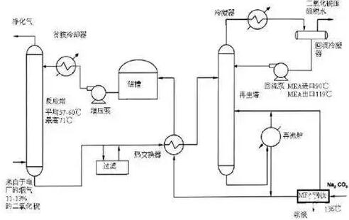 主要工藝原理: 工藝流程主要由三部分組成:以吸收塔為中心,輔以噴水冷卻及增壓設備;以再生塔和再沸器為中心,輔以酸氣冷凝器以及分離器和回流系統(tǒng);介于以上兩者之間的部分,主要有富酸氣吸收液、再生吸收液換熱及過濾系統(tǒng)。 從爐后經除塵、脫硫后引來的煙氣溫度約為50℃,經設置在CO2捕集裝置吸收塔前的旋流分離裝置將煙氣中的石膏液滴脫除并降塵,然后進入煙氣冷卻器中與循環(huán)冷卻水換熱,使其溫度降到~40℃,達到MEA理想吸收溫度,通過氣水分離器除去游離水后經增壓風機加壓后直接進入捕集裝置吸收塔進行CO2吸收[煙霧凈化機]。 設置煙氣預處理系統(tǒng),脫除煙氣脫硫后攜帶的粉塵、水等雜質對系統(tǒng)的長期穩(wěn)定運行有利,同時使用抗氧化劑和緩蝕劑,吸收劑消耗低,設備腐蝕小。增壓風機用來克服氣體通過捕集裝置吸收塔時所產生的阻力。 在捕集裝置吸收塔中,煙氣自下向上流動,與從上部入塔吸收液形成逆流接觸,使CO2得到脫除,凈化后煙氣從塔頂排出。由于MEA具有較高的蒸汽壓,為減少MEA蒸汽隨煙氣帶出而造成吸收液損失,通常將吸收塔分成兩段,下段進行酸氣吸收,上段通過水洗,降低煙氣中的MEA蒸汽含量。